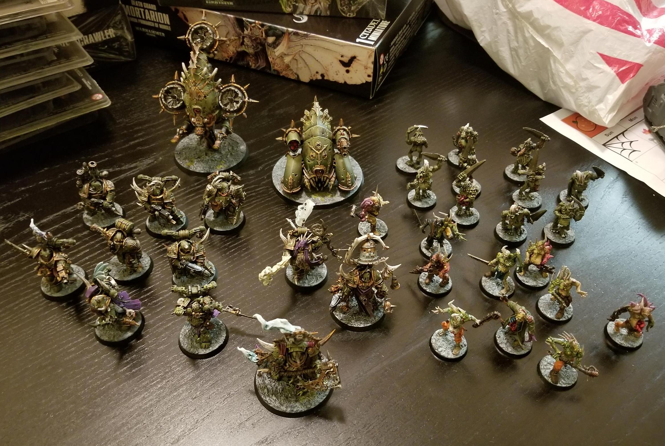 Currently I have about 1,000 points of Death Guard painted, including a squad of 10 metal Plaguebearers. This includes the entire Dark Imperium set, plus a Necrosius the Undying (the Forge World Plague Marine Sorcerer, a much better model than the Malignant Plaguecaster) and a single Myphitic Blight Hauler.