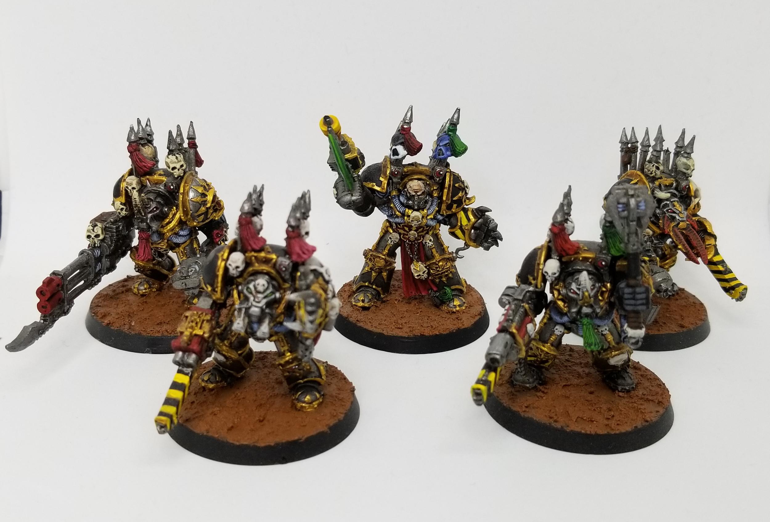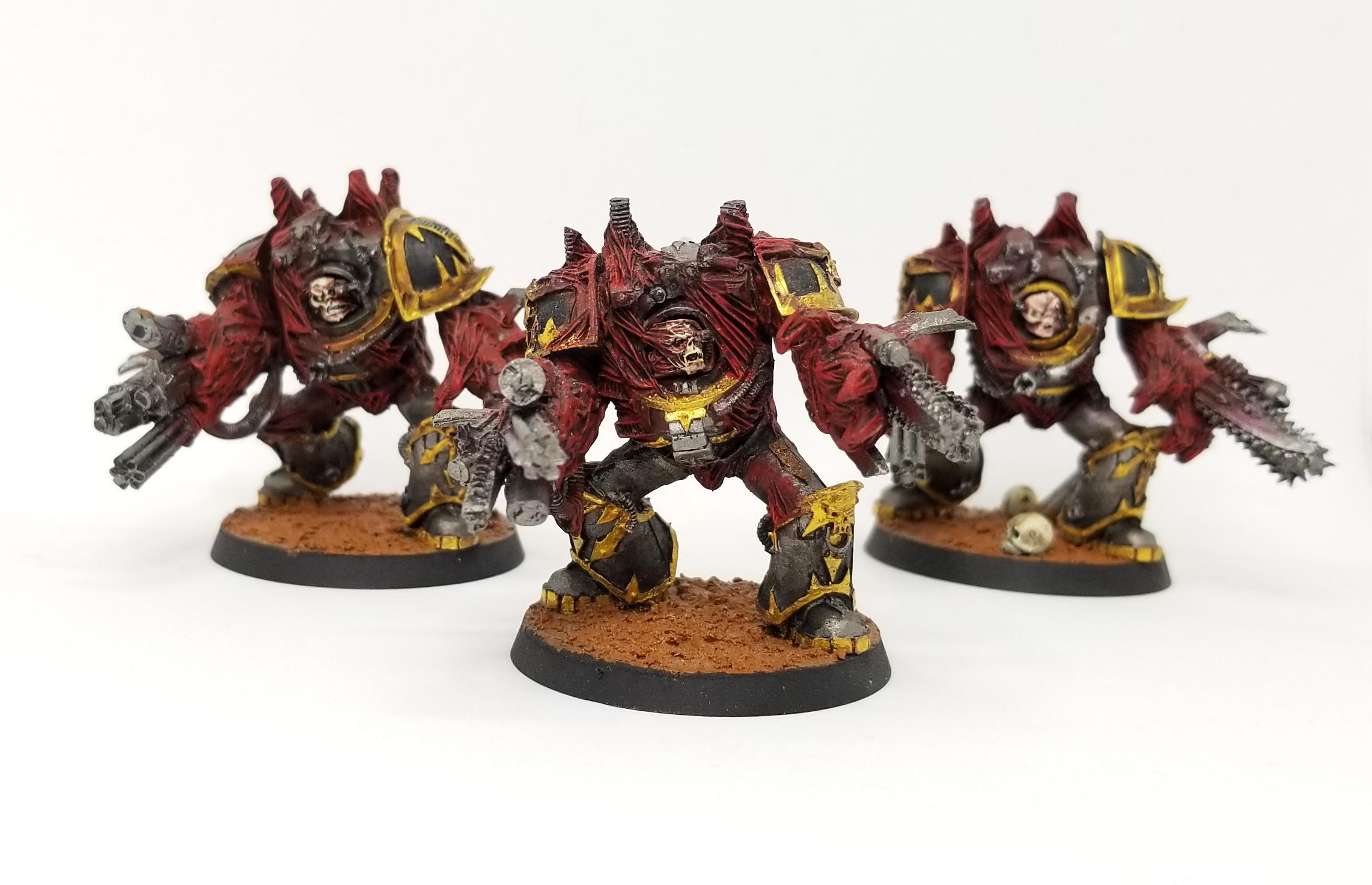 I've got 10 terminators in the army, a collection of the old metal boys who are definitely small compared to the current plastics but damn if they aren't still amazing models packed with detail. I was actually kind of disappointed with the new plastic terminators; they aren't much more detailed than the previous plastic kit (though they are better-posed), and their weapon options really suck - you only get one chainaxe in the entire box and it's the default option on the model! As such, I'm not likely to replaze these guys ever, and I really like how they turned out. The champion up there is a conversion of a finecast Abaddon model I bought for another conversion (I only needed the head, arms, and trophy rack from it), and is one of the few finecast models I haven't hated.