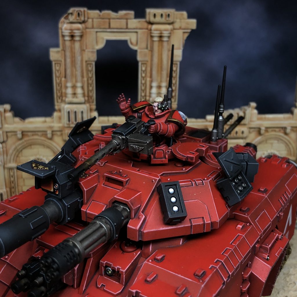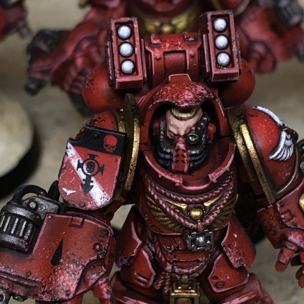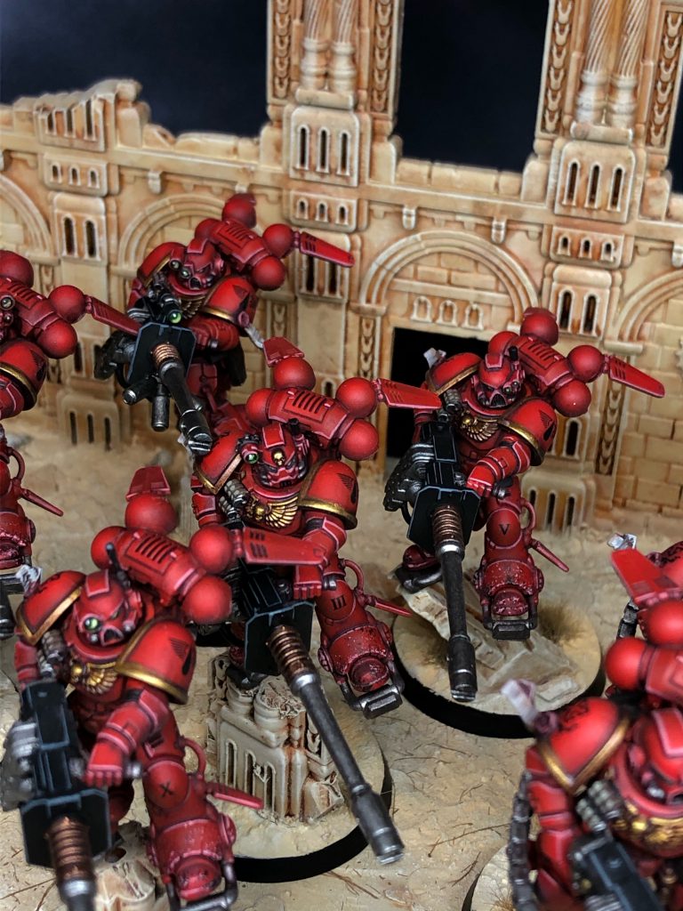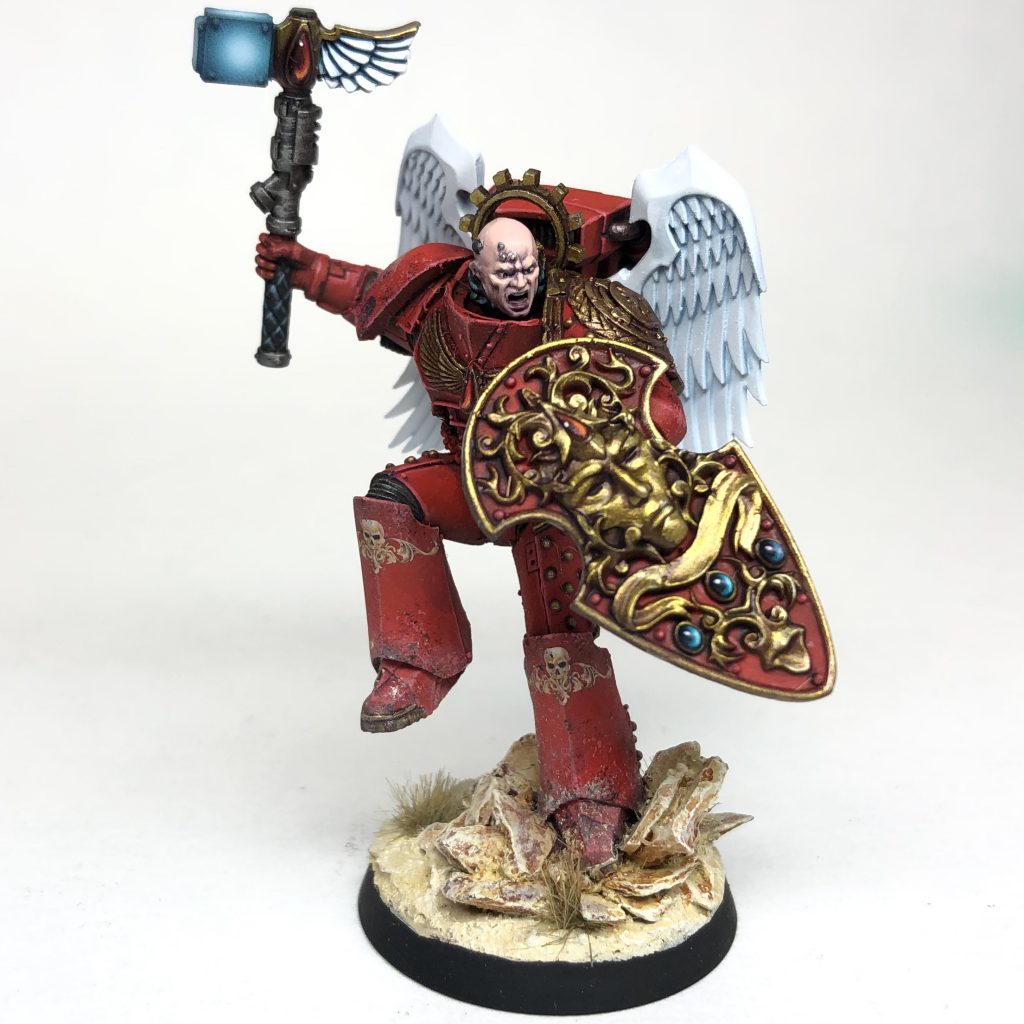 An important question at the onset was also: If I’m going to do a Blood Angels army, what is going to make it different from other Blood Angels armies? Scaling up the models to fit in with Primaris was one way, but I also wanted to distill the paint scheme down to a core palette, and then scrape that palette across the parking lot to scuff it up. Red. Gold. Black. White. The sand of Baal.