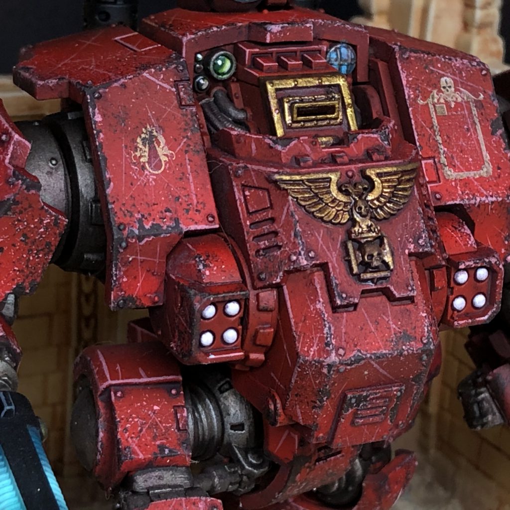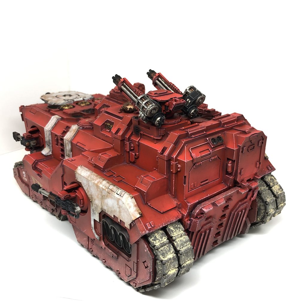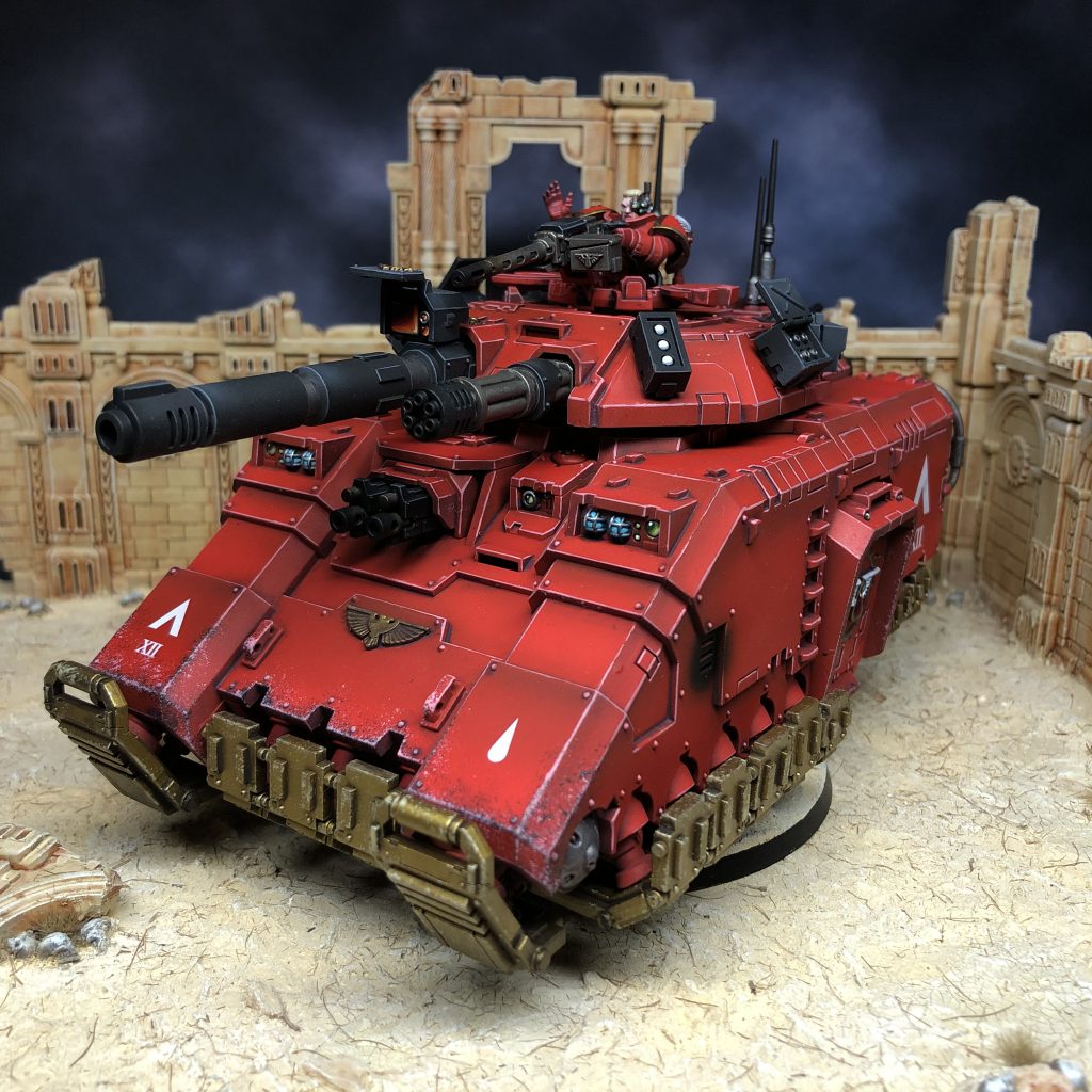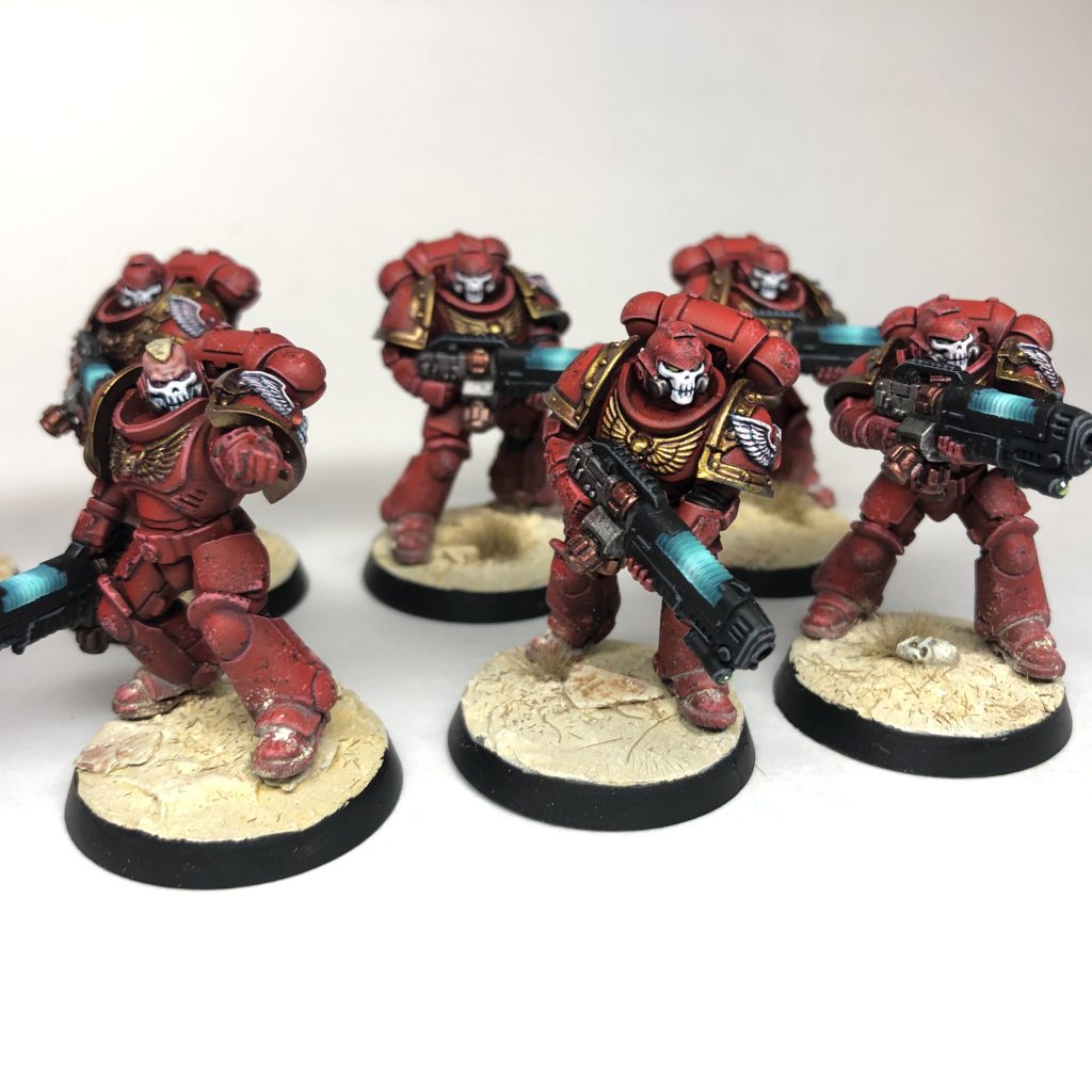 I eschewed the more modern 40k iconography in favor of a more Horus Heresy-era apporach: Red armor, gold shoulder pad trim, green lenses, black bolter casings. Gold helmets for veterans/officers. Forgeworld’s Blood Angels Legion transfer sheet for icons. Chipped and dusty armor. Blood. Minimal OSL. I wanted to take the image of the perfect and polished artists, the flawless Sons of Sanguinius, and make them look like they’d been fighting across shattered rockrete for months. Later I would throw in another homage to an earlier aesthetic by painting a forward operating force within the army (mostly Phobos units and fast movers) in a desert camo scheme inspired by 2nd Edition camo Rhinos and Land Raiders.