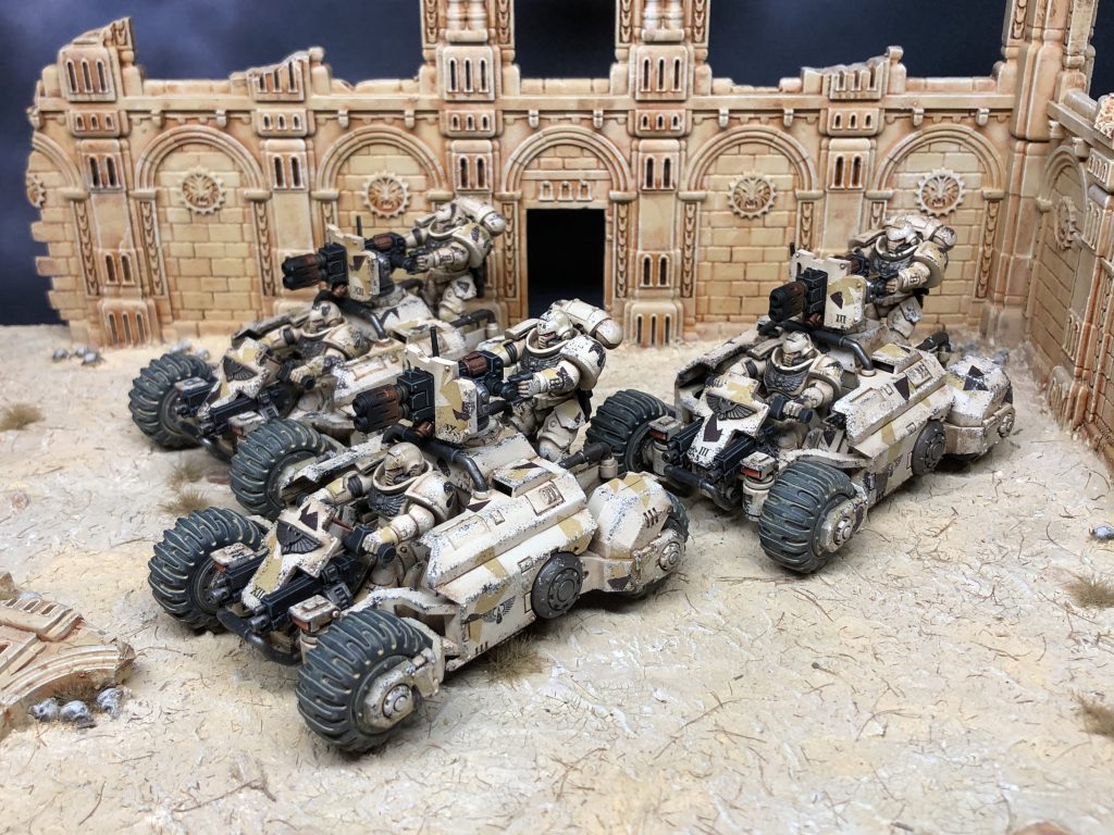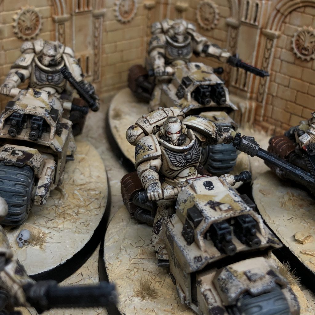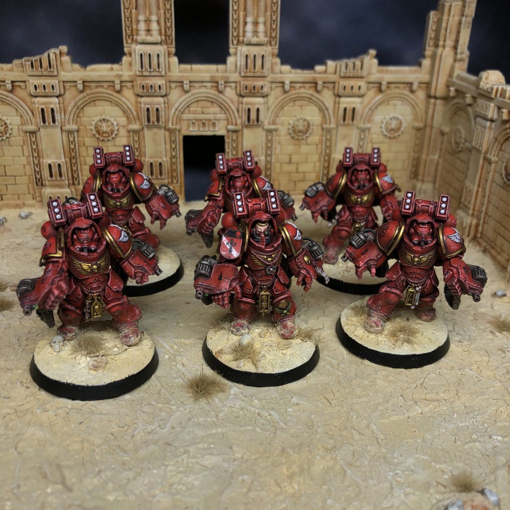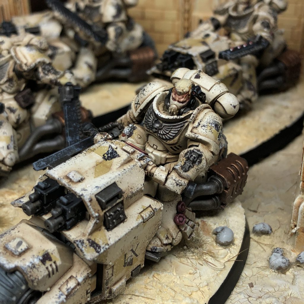 I eschewed the more modern 40k iconography in favor of a more Horus Heresy-era apporach: Red armor, gold shoulder pad trim, green lenses, black bolter casings. Gold helmets for veterans/officers. Forgeworld’s Blood Angels Legion transfer sheet for icons. Chipped and dusty armor. Blood. Minimal OSL. I wanted to take the image of the perfect and polished artists, the flawless Sons of Sanguinius, and make them look like they’d been fighting across shattered rockrete for months. Later I would throw in another homage to an earlier aesthetic by painting a forward operating force within the army (mostly Phobos units and fast movers) in a desert camo scheme inspired by 2nd Edition camo Rhinos and Land Raiders.