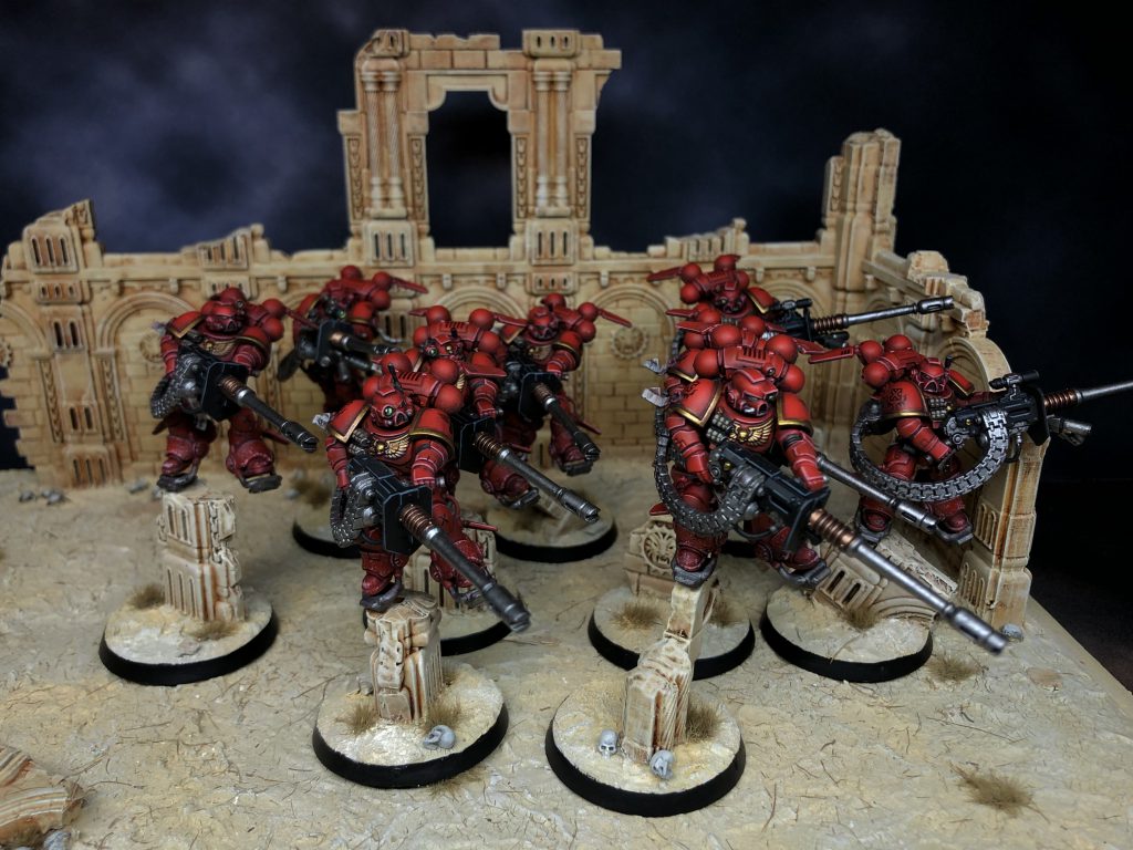 It speaks to the strength of the Primaris Marines line of models that they hold their own in the collection alongside extensively kitbashed and converted specialist units. The forward ops contingent of the army is also a great example of how just changing the color scheme for these models can give them a completely new impact. The forward ops/fast mover contingent of the army has emerged as one of my favorite parts of the project. I use shard camo stencils from Fallout Hobbies to lay down the camo pattern, and then apply an oil wash filter over the models to shade them and give them that gritty finish that’s expected of units in the field. Painting that portion of the army is such a different approach that it feels like painting an entirely separate army, which is a welcome respite when working on a sea of red models!