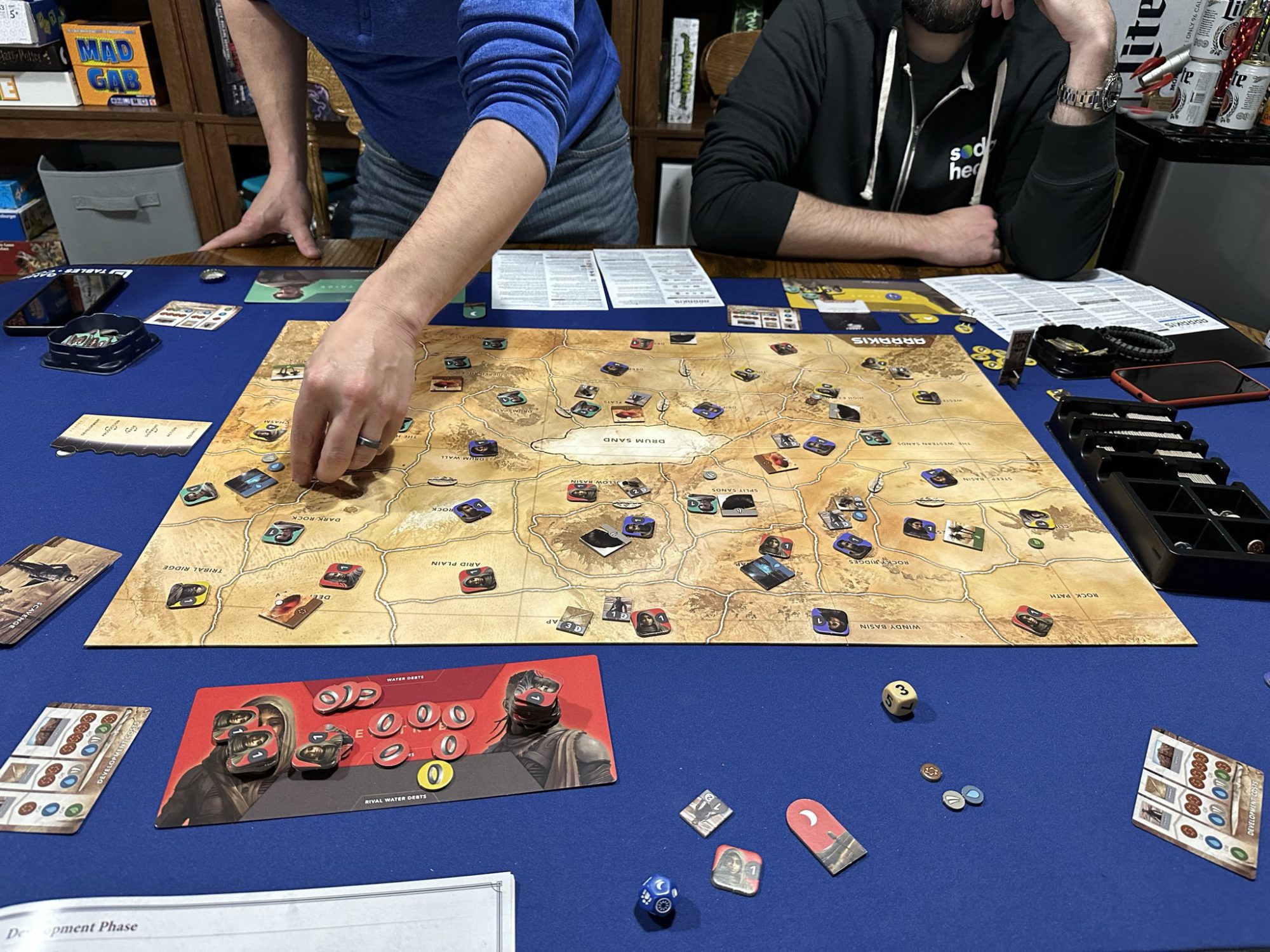 Arrakis is a game with a firm structure. Combat is an exercise in math, there are no unknown elements like cards or dice. Upgrades like crysknives are purchased and placed out open to all. Opponent’s can intervene but you lose nothing; just take back the attack and go somewhere else. Unless you change the rules.