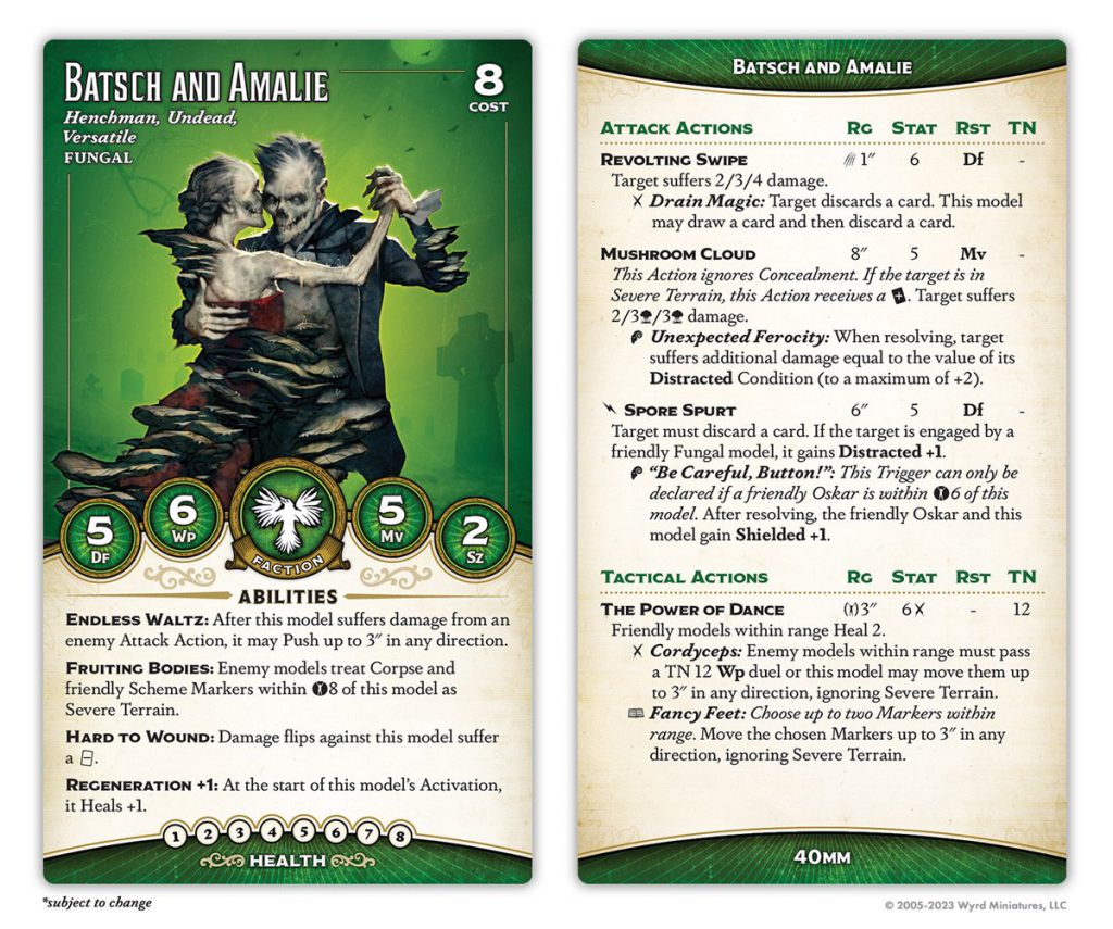 Our last new friend(s) of the day is (are) Batsch & Amalie. If Commander Bura is a preview of the Guild starter box, B&A are most certainly her Resurrectionist counterpart(s). In terms of stats, the two are identical, with Batsch (I'm not going to write out the full name each time; sorry, Amalie) having one more health, as befits a Resser. But the similarities end there.