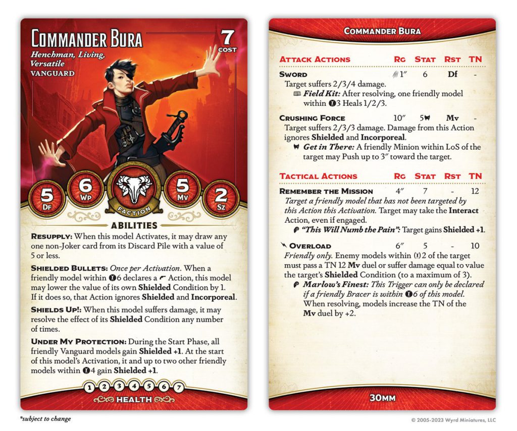 Overall, I like Bura, especially at 7 stones. The synergy with other Vanguard models is strong, so her playability will depend on how good they are, but she plays very nicely with a Lawyer. Just make sure you're hiring some damage dealers, since she won't help you much there.
