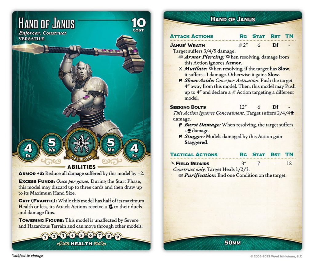 never let this thing go Frantic in your lines. Its melee attack, Janus' Wrath, meets the gold standard for beatsticks in Malifaux: a 2" reach, Stat 6 3/4/5 with three good triggers. In particular, Shove Aside is a