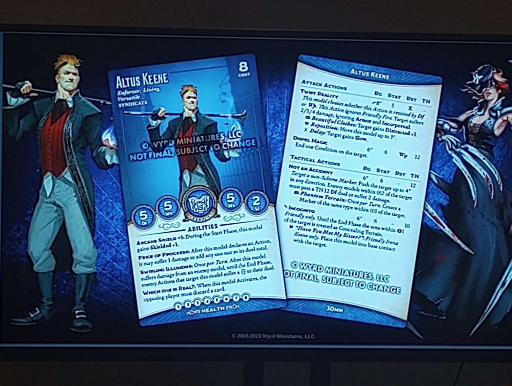 Altus's Tacticals are... interesting, to say the least. Incognito is very very cool, given how many Syndicate models have Flexible Morality; normally, people can avoid the hand pressure by just Focusing, and Altus turns that off. He may be worth taking just for that (and note that a Concealed Winston is a nightmare to shoot, and this ability stacking with Swirling Illusions may be enough to keep Altus safe, but relies on you taking one to the chin). The trigger is cute, since a 6"-plus-base-size place is a lot for a bonus action, but it'll depend on how good Irena is.