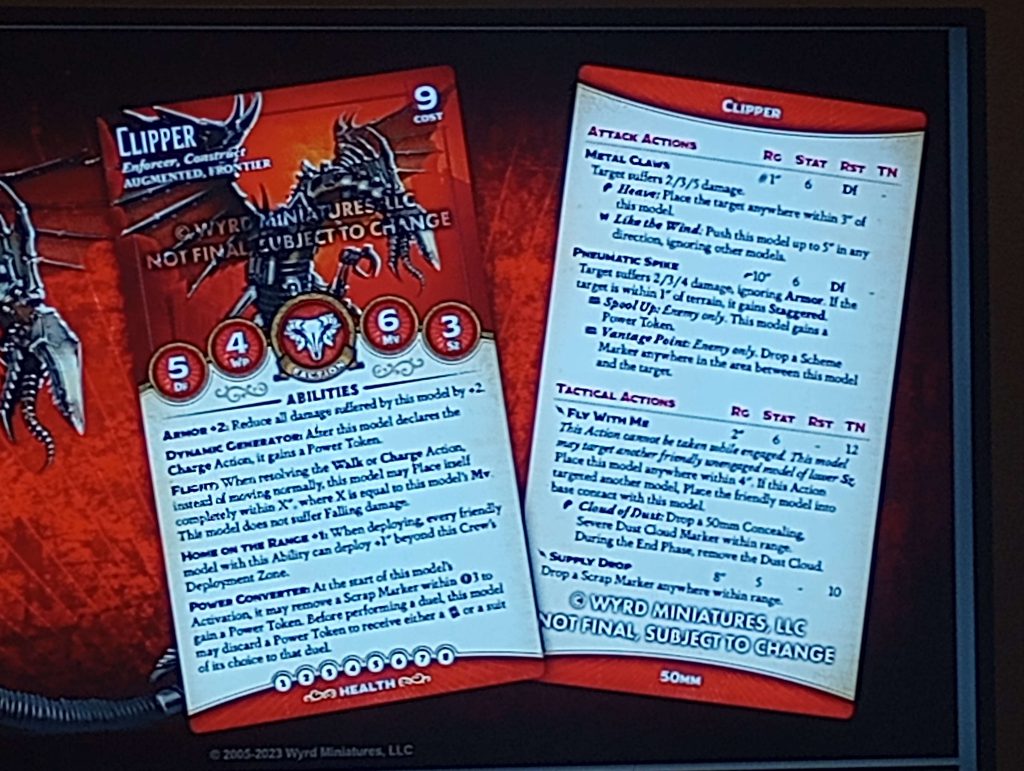 Clipper is a good clean example of how these dual-keyword designs work: like most Augmented models he's got Power Converter, like most Frontier models he's got Home on the Range, and he kinda does stuff both crews want. Specifically, he's a flying, Armored beatstick and gun turret that offers both mobility and enemy displacement, two things that never go out of style.