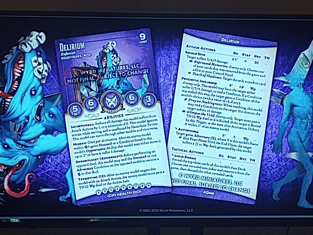 He looks a lot like an upgunned Insidious Madness, and his front of card doesn't dispel that impression. Incorporeal, Terrifying, 9 health and 5/6 defenses is surprisingly beefy for Neverborn, and his Mv 6 makes him speedy as well. He's got the standard Woe suite of Misery/Opportunist, this time keying off Adversary, which is an interesting choice because removing Adversary prevents the rest of your crew from taking advantage of it - so there are choices to make there. He also Lucid Dreams like many Nightmares, though note that he can't use the removed cards.