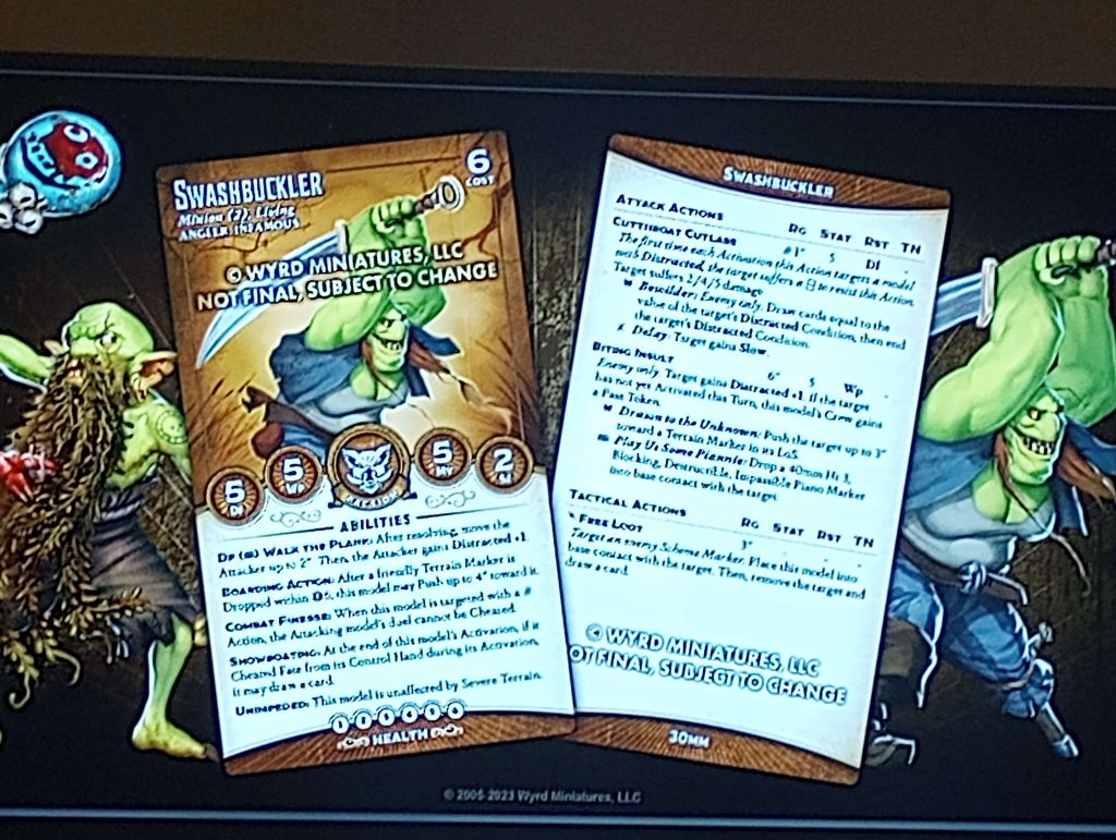 haven't got both keyword abilities, since they Showboat but don't have Chum the Waters (though Unimpeded at least means the markers don't slow them down). Defensively, their stats aren't great and their health isn't high, but they have the interesting combination of Combat Finesse and Walk the Plank. This means any melee attack against them is a gamble, since if the attack flips poorly and the Swashbuckler has a high enough Tome, they can just completely no-sell the attack