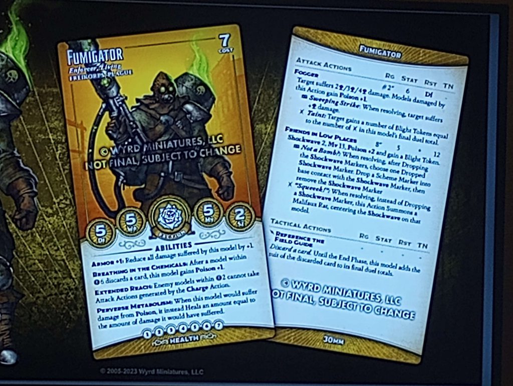 target rather than everyone hit. That's a bit unintuitive and also a bit of a shame, since otherwise this guy would have a niche as aoe Blight Spread. However, the Fumigator's ability to Reference the Field Guide ties the model together: you can build in any of those useful triggers at the low, low cost of a card, which incidentally gives him a Poison, which heals him, and so on, etc., world without end.