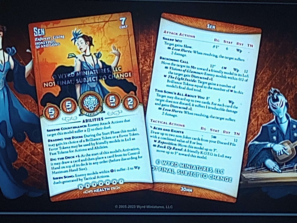Our last new friend today is Sen (although she appears to have a friend of her own, off to the right there, probably the K.O.T.O. mentioned on her card). I've been vocal about my thoughts on Qi and Gong, and right from the start, Sen addresses one of them: the biggest issue with a crew that generates and spends Pass Tokens for effects is that the most powerful thing you can do with Pass Tokens is to, you know, pass activations with them. Favor Tokens solve that problem, and they let Sen interact with both of her crews' mechanics without having to stack too many rules on her front of card. Beyond that, she's got Serene Countenance for a little defensive boon (not too much - she's got bad stats and low health, so she will die if focused) and Rig the Deck because that's what Honeypot models have. Siren Song is a particularly interesting aura, because raw stat penalties in Malifaux are