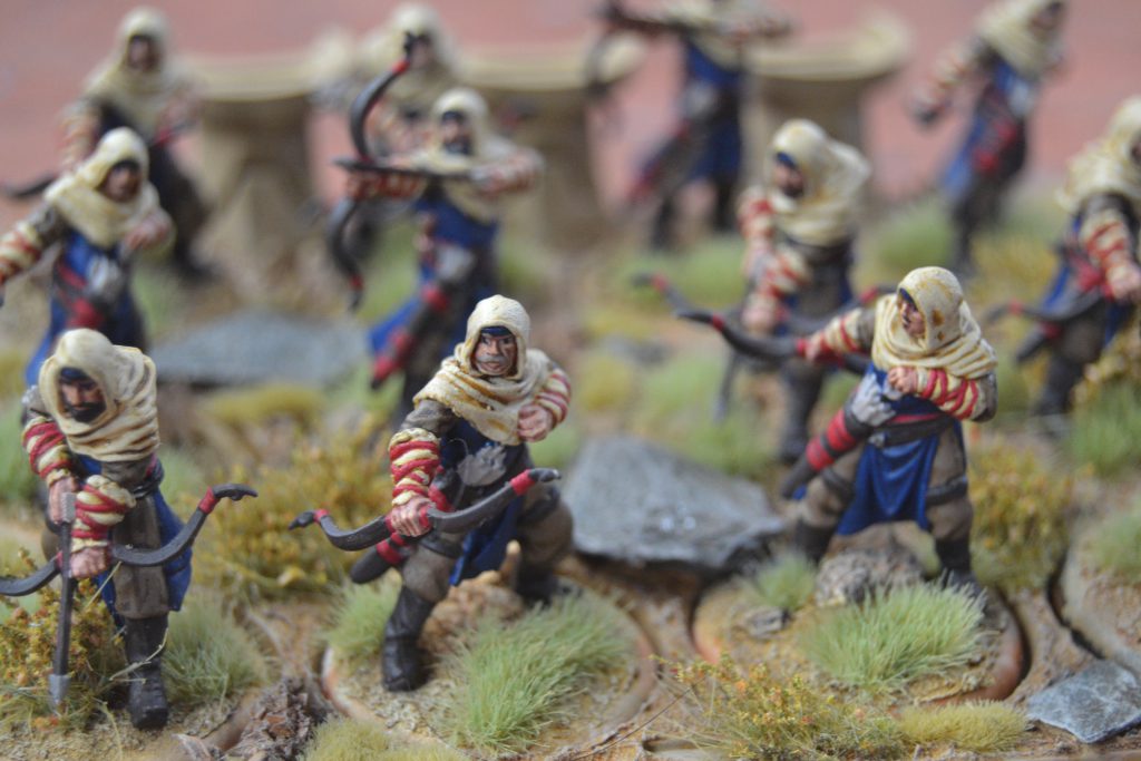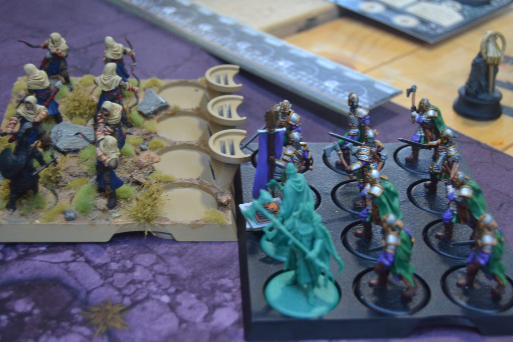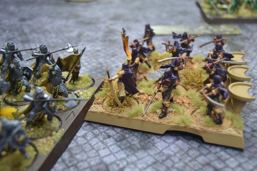 My plan to win the game was forming. I needed to hold the middle with the Royal Guard, whilst my Skyreach Bowmen dealt out a number on the Vanguard, hopefully reducing them by a rank to make them think twice about trying to engage otherwise the Royal Guard would finish them. If the Sand Skirmishers needed to assist then my own Quick Fire could help out. But they needed to deal with the Vets to secure my rear since the Retinue was struggling to hold the left flank. My biggest concern was the Vanguard barreling in and taking down the Bowmen before I could do enough work, furthermore, Jon was still staring me down with the Ranger Hunters. If George was to ramp up the pressure then something was surely going to give.