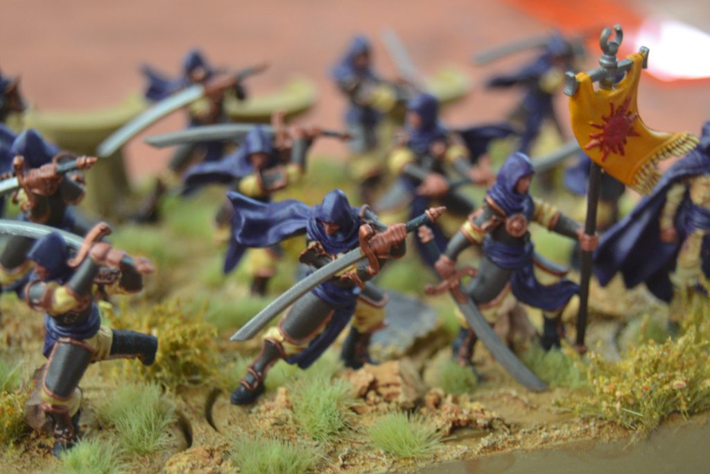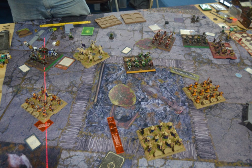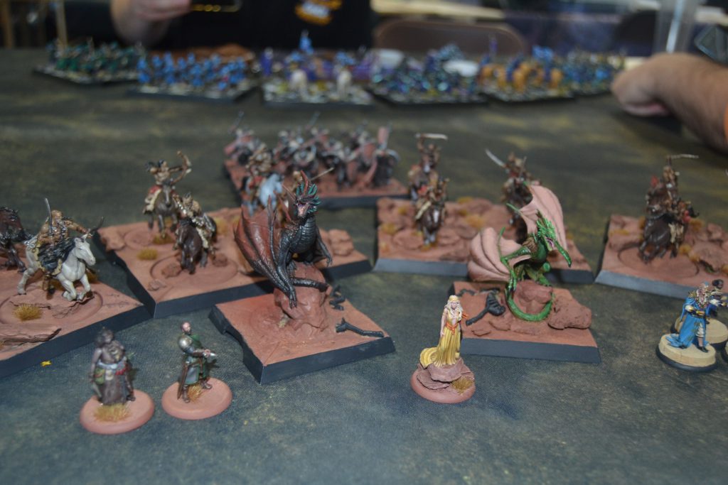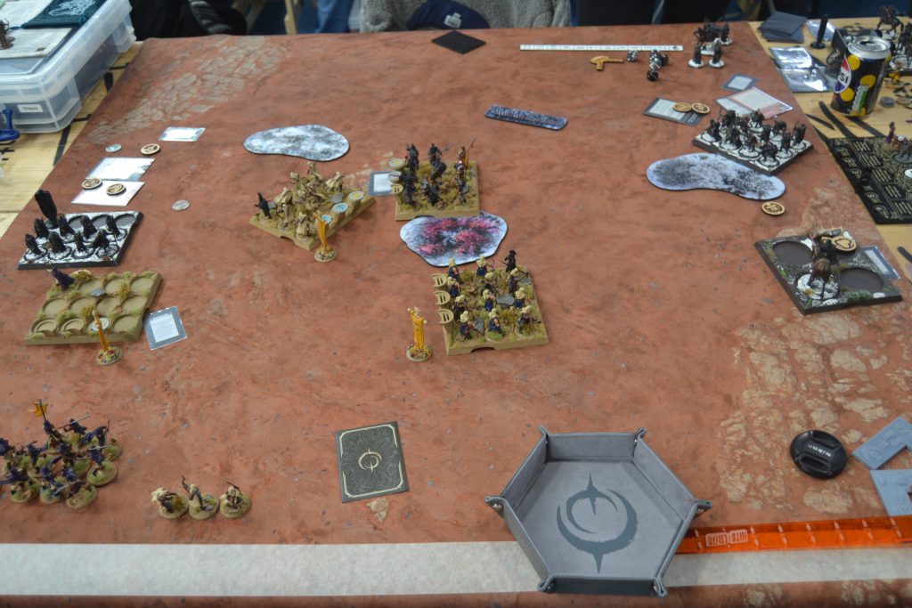 George pulled back, biding his time, and banking on the Vets breaking through and becoming a thorn I would need to deal with whilst he would either over take on points or hammer me from the other side. But the hefty damage from the Skyreach Bowmen put the Vanguard in a position where they did not want to push their luck, Jon did not see a way to cut through the Royal Guard, and the Sand Skirmishers shut down the Vets. Eventually the Skyreach Bowmen ended the Vanguard leaving Jon’s Ranger Hunters left. If George was one dice more fortunate with Othell or the Veterans, then the Retinue would be dead and I would have a serious problem in my rear whilst staring down another in the front. It was just enough of a delay that squeaked me an advantage. We are now a game each from events so we will have to settle the score at the next one!