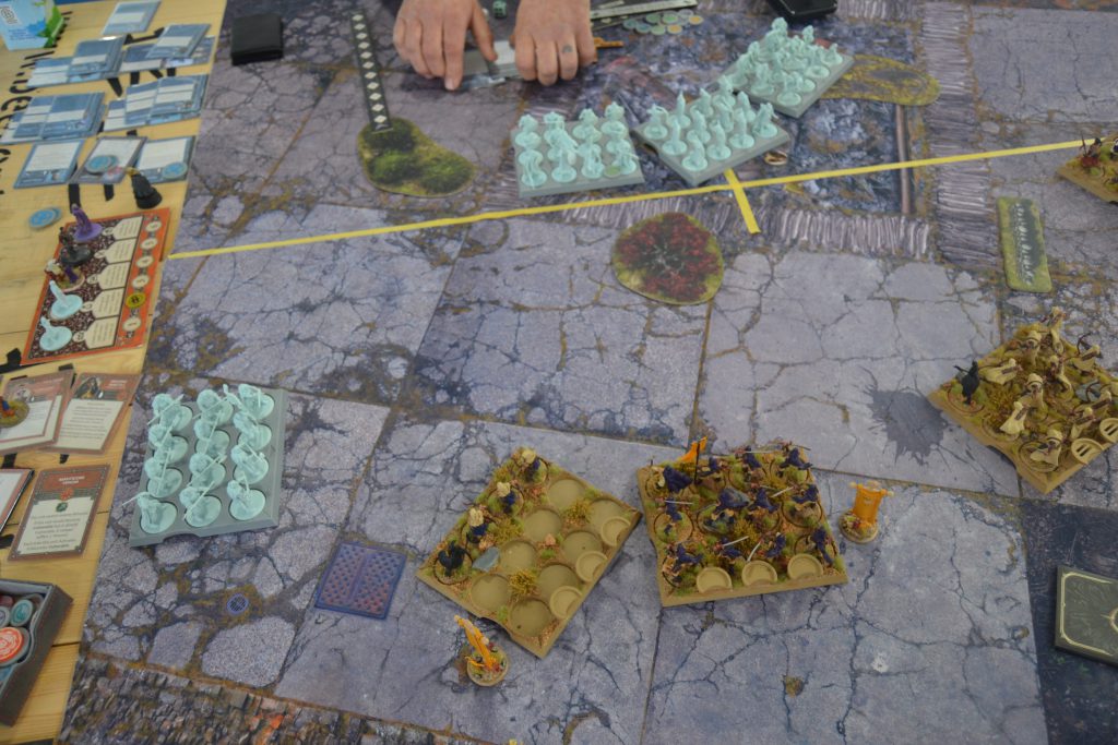 By the start of Round 4, we had dodged giving each other points from the cards and it was 0-0. But the cards now coming out would mean there would be some scoring. Oberyn got hit hard by the Halberdiers throughout Round 4 and 5, but was in a position to take them out at the beginning of turn 6. My Sand Skirmishers gave the central units some issues whilst they positioned themselves to fallback to my right objective, and the Skyreach Bowmen did the same from the opponents right side objective. If I could take down the Halberdiers and then march/Cunning Ploy Oberyn onto the left side objective, I could outscore Ray with the point per objective card. But there was a problem.