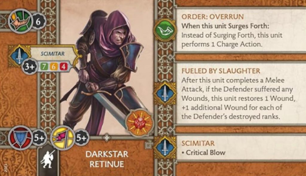 With Gerold Commander this Unit gains access to Boldness and Courage as well as Marital Training making them particularly deadly in combat, some of his Tactics Cards could work to make them better on the table such as Lone Knight if they are off on their own or Coup Attempt if played correctly, however Reckless Strikes is worthless for this Unit. Unfortunately, whilst being called Darkstar’s Retinue they are much better almost everywhere else.