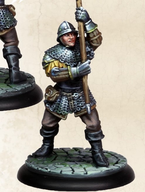 The Oldtown Peacekeeper has their rules covered up, but you can get the gist that they provide a short range defence against charge bonuses. This is the only place I have seen this and there is a lot of boosting each other in the Greens Faction. The designers have tried to incorporate the defensive abilities of the Halberd Units in the main game over in the base game when there are less models.