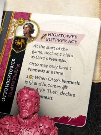 Motivation Design - Otto’s Motivation is incredible and truly sets up the difference in power between himself and Aegon’s Motivation for the same cost of 1 Gold, but buying Otto is cheaper than Aegon. 1 Gold for 1VP with Aegon or 1 Gold for 4VP with Otto, it is an obvious choice. However, Otto’s pick must be a Hero which should make it harder to deal with but not impossible and is a better choice than Aegon. However, there are so many hurdles to jump through, you must crush their morale then capture them to gain the points. Worth the effort though.