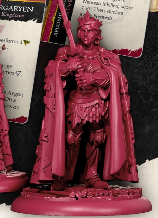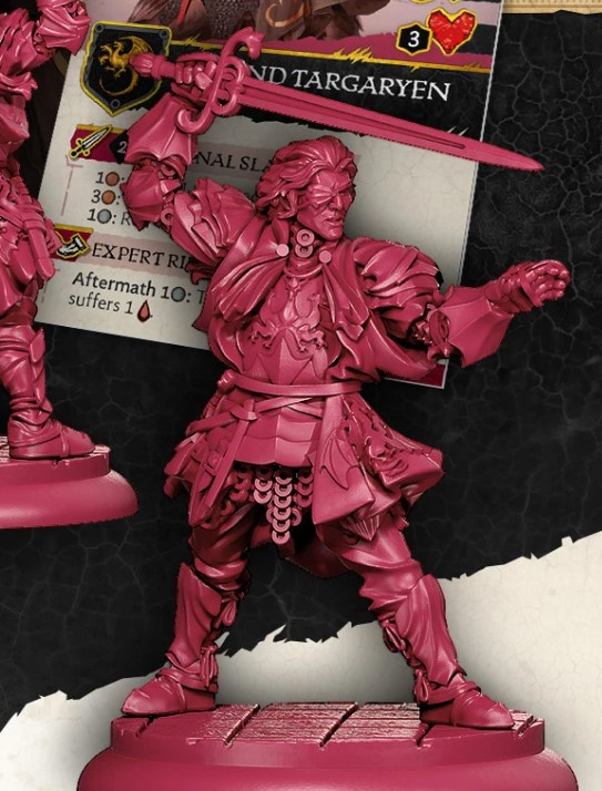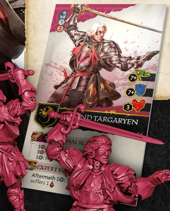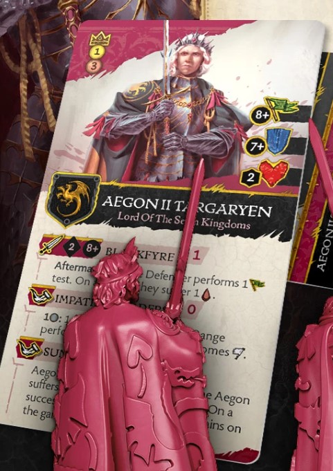 Rules Design - I love the idea that Aegon’s combat stats reflect a very novice swordsman but with Blackfyre it can still pack a punch. Blackfyre has some similarities with Lady Forlorn and Dark Sister which sets up a universal design of Valyrian Steel. There are some other abilities that force a Routed condition or a chunky rule involving Aegon’s dragon. But we cannot see them in full to understand what they do.