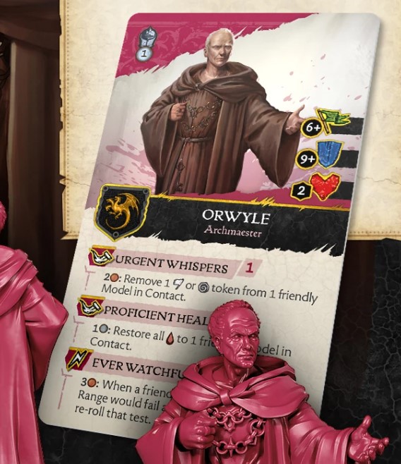 Rules Design - Orwyle can remove debuffing conditions tokens, heal a character of all their wounds, and allow friendly characters to re-roll their tests. He is a great support piece that can keep your force at the top of their game for longer throughout the fight. This represents the advice, medical expertise, and reliability that all Maesters have to their holds. With a lot of the models not being that great defensively, the alliance wiht the Grand Maester will be important. A perfect set of rules that could potentially be very powerful in the game.