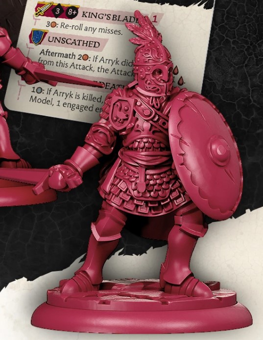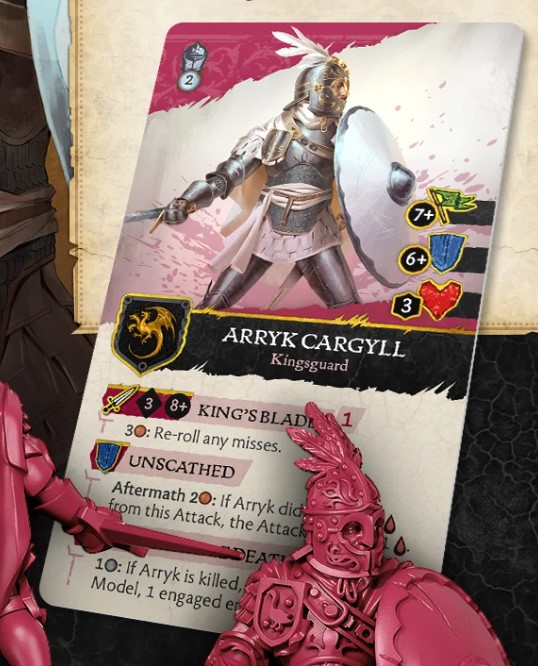 Rules Design - Remarkably Arryk is vastly worse in combat than his twin but there is a reason for this. Whereas Erryk boosts Rhaenyra, Arryk can boost other characters not limited to someone specific. When he doesn’t take any Wounds, he can deal out some damage, or if he dies one model engaged gets to do something, which we would know what that is if it wasn’t covered up. I assume this might be an action though.