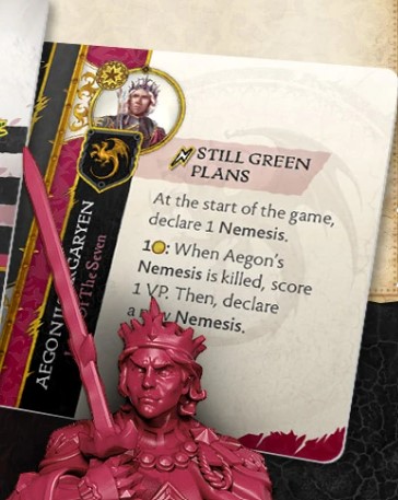 Motivation Design - The Motivation is one of the worst I have seen. 1 Gold for one VP is poor in comparison to other Motivations when you target a character and kill them for some VPs. 1VP is way too low and should be increased to at the very least 2, however the other places where you gain VP in this way you need to be engaged whereas this is just when they die, so Aegon can be safe and still score from the Motivation. We do not get to see the rule change for when Aegon is killed. I don't particularly understand the Motivation either, in the books it is hard to know who Aegon is since the official statements are fake most of the time, the jester Mushroom has some outlandish takes but is the closest we get to knowing who Aegon actualy is, thus what his Motivations are.