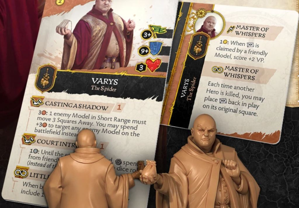 Rules Design – Varys has some very interesting abilities that casts a daunting shadow of the battlefield. Casting a Shadow ability allows Varys for 3 Copper to force a model to take a move action away from Varys, this is only within short range, but you can spend 3 more Copper to select any model on the battlefield. This is a lot of copper to spend for the ability but could result in a model needing to take additional actions to get into position. We have only seen Tullys with movement abilities, but this effects allies, whereas this is the first one that impacts the opponents’ characters.