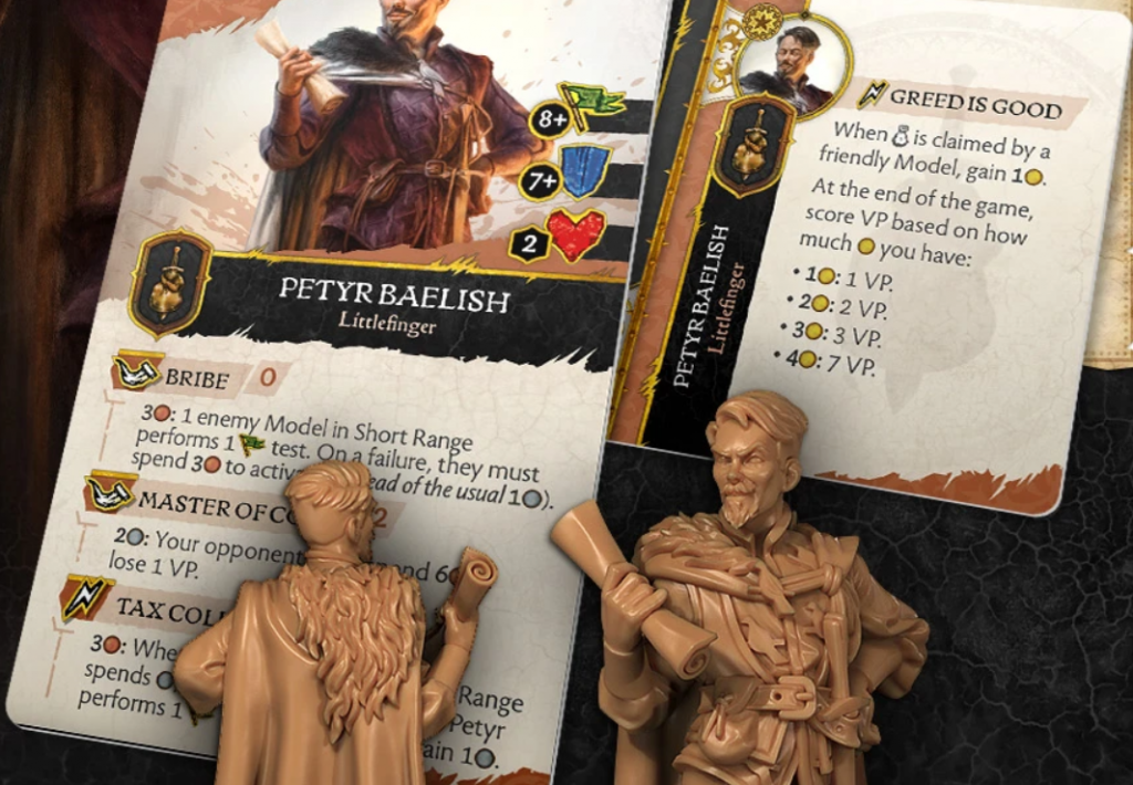 Rules Design – Varys and Petyr are really two sides of the same coin. Both have huge impact on the game by controlling the battlefield. Whilst Varys is more about defence with his abilities negating effects and keeping enemies away, Petyr is about locking down the enemy with debuffs. He has a free action called Bribe which forces an enemy to make a Morale Test and, on a failure, must spend 3 Copper instead of 1 Copper to activate. Imagine this on The Mountain who needs to spend some more Copper to prevent themselves from going into a rage and hurting everyone. Deciding when to use this is important, as too early on and the opponent may not care, but later into the Round it could limit what the opponent can do, and you could do it three times if you wish.