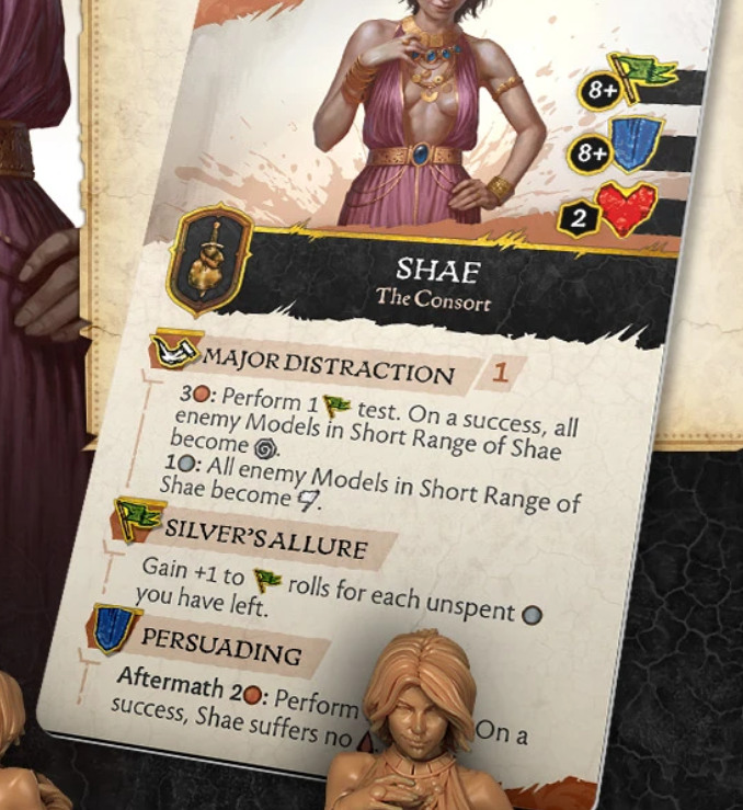 Shae has the Major Distraction ability which is an aura of debuffs for the enemy. For 3 Copper, everyone in three squares gains the Shaken condition, but in addition, if you spend 1 Silver, then they also gain the Routed condition. This can be a brutal moment in the game which shuts down the opponent if Shae can get to an ideal position to utilise it. However, she does have to pass a Morale Test for this to work which is a 8+ so not likely.