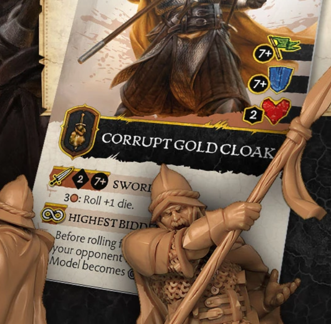 Rules Design – An all-round decent Soldier for the Neutral Faction. 7+ for Morale, Armour, and Melee is okay, it could be worse. They can be paid to roll 3 dice for their attack which means a lucky roll could bring down some of the better opponents. However, they are corrupt. The opponent can pay Copper to debuff the model with a Shaken token making his next roll -2 to the result. Whilst fun, and thematic, they cost the same as a Flea Bottom Sellsword who does everything the Gold Cloak does but better. The only argument I could see for the Gold Cloak is 1 Copper cheaper to have the exact same dice roll, or to be bait for the opponent to spend Copper debuffing rather on their own Units. The opponent should never spend this Copper but a sprinkle of fear may force them to do so. This is not enough to warrant them to be taken, might need a little glow up before release.