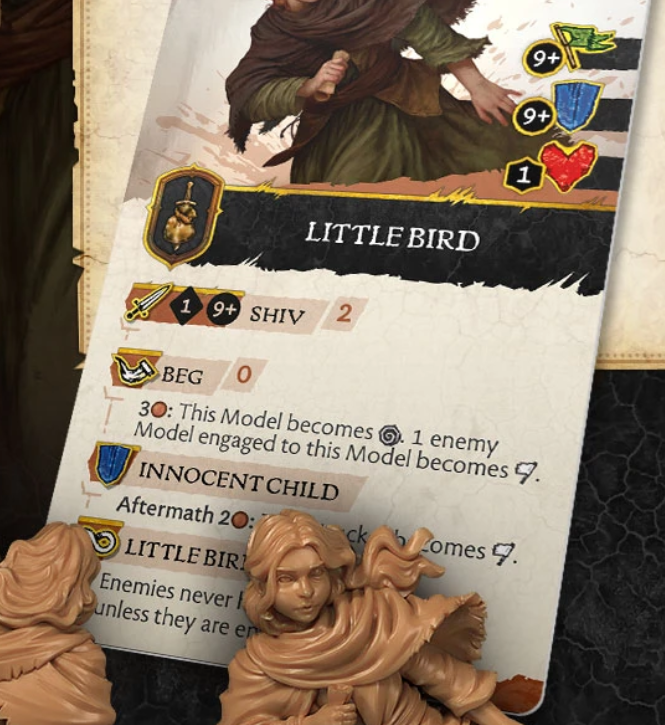 Rules Design – Whilst the Little Birds have an attack, likely due to them being used to murder more helpless players of the great game like Pycelle, you are unlikely to use it at all when it takes two actions to do so. But their strength comes from debuff abilities, but also for other Factions looking to pick up a Neutral Soldier model to help with control. Beg is a free action so you can do it three times and force Routed conditions on to models you are engaged with. You can also hand out the Routed condition through an Aftermath ability which can have a model endlessly locked in restricted activations. Further to this, there seems to be a targeting ability, likely due to Varys having his Little Birds seemingly everywhere without a spy ever being captured.