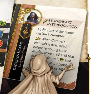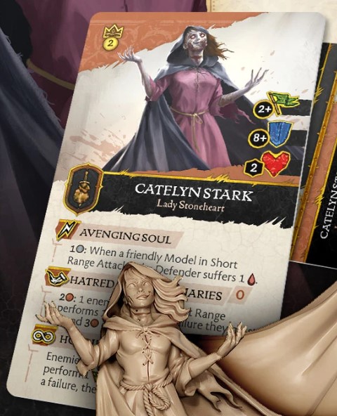 Rules Design - Catelyn is still a support piece from her counterpart in the Stark Faction. She gives an aura of extra damage to all friendlies without needing to succeed with an attack, which means you can chip kill targets by swarming them. This might be a bit too strong, for anything with multiple attacks especially. Catelyn must be a priority for the opponent, and it is not difficult to kill her with 8+ Armour Save and 2 Wounds. She does have an ability that haemorrhages the opponent's resources which is also a part of her Motivation.