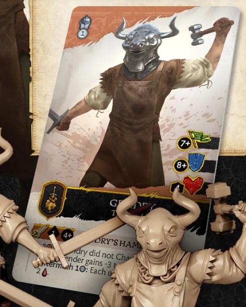 Rules Design - Gendry is super tough to chew through due to the massive 4 Wounds he sports, although his defence save is low, you will need multiple attacks to bring down the bull. He has a great combat statistic hitting on 4+ but if you do not charge it looks like you gain a bonus of a debuff to the opponent which could be the hammer concussing and that could stack with the Shaken effect. But there is also an Aftermath that can cause additional Wounds.