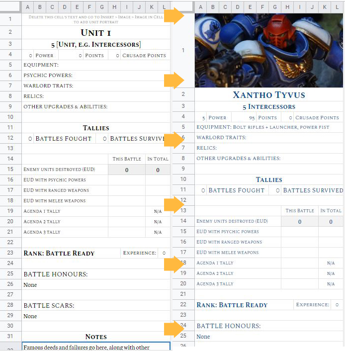 There is a tab called 'Order of Battle' that has various automated cells that calculate things like points, supply usage, crusade points, and so on. Each unit also has a tab to store information like their experience, abilities, combat tallies, and relics, just like the official roster. Once you've entered the details for your individual units, you can use the tick boxes on the Order of Battle sheet to quickly tot up the value of the force you want to use for the next game.