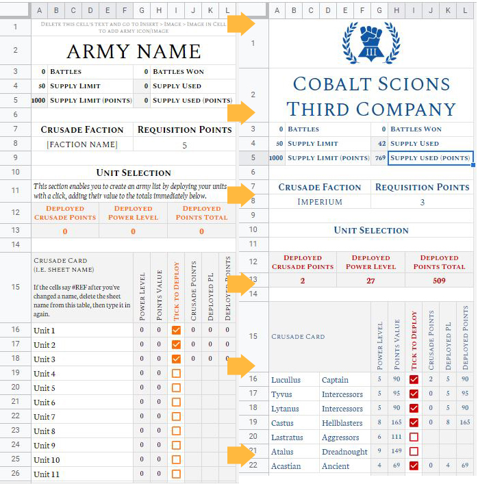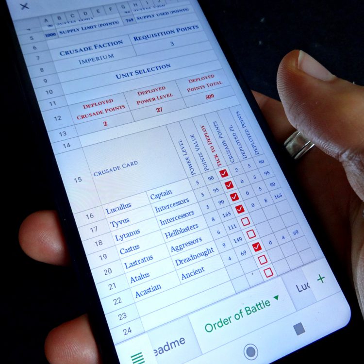 Crusade is awesome, but does entail a lot of bookkeeping. Back in September 2020 I made an automated Crusade Roster to mitigate this. It's designed to suit tracking your Crusade force on your mobile phone using Google Sheets. As such, the tabs are formatted to be easily navigable on a small screen rather than a PC. Because it’s a Google Sheet, you can update it on either your computer or your phone, and any changes you make will update across those platforms. It also means the folks in your Crusade can easily all share your rosters with each other.