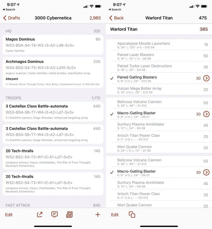 Quartermaster is probably the best specialist games list building tool, with at time of writing every option included for Adeptus Titanicus, Necromunda and Horus Heresy, among other games, but its real value here is its user interface. I will die on the hill that Quartermaster provides the best user experience of any list building tool out there. Requires a one time purchase and is, sadly, iOS only, but if you’re playing Adeptus Titanicus (and you should be) or another specialist game, this should be your first stop.