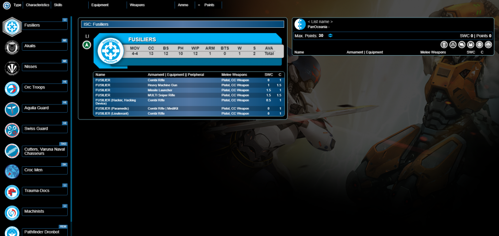 proprietary army builder app for building forces in Infinity; you can either access the web version via their site or download the mobile app version. It's an amazing app, even moreso because it's completely free, but it'd be great even if it wasn't. Pretty much everyone uses the official app for building lists and it should be considered the "gold standard" for army builder apps in the business.
