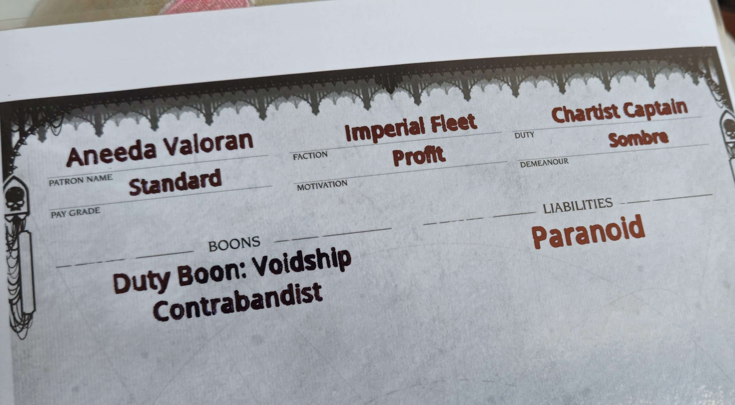 Imperium Maledictum roleplaying game. Anyone who has tried to use a sharpie neatly on a laminated sheet knows the horror that quickly ensues. Well, I'm happy to report that this slightly odd use case was very successful. My campaign's Patron Sheet has perfectly neat writing. After the initial success, I re-ran it with a permanent marker fitted into the toolhead and it looks great.