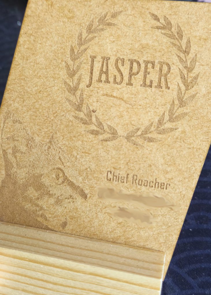 Personalized gifting is easier than ever. This work-in-progress laser engraved gift for a friend's housecat was designed from scratch using a mix of photographs (cat) and lettering in Bambu Suite.
