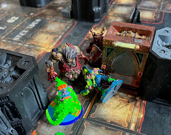 may have made a rule mistake here because the Warp Horror’s Terrifying ability says the attacker simply can’t make a Fight action at all, which I now suspect means it shouldn’t have been able to make a Reaction attack. The whole Close Combat phase simply shouldn’t have happened. But a) I’m 99% sure nobody has ever played a perfectly correct game of Necromunda, b) I’m the arbitrator so I only have myself to blame and I was the one harmed by the call, and c) it played into the narrative I wanted anyway, so I am not in any way mad. Monsieur Macron smacked Jubb hard, dealing seven damage after a dazzling array of armor save failures. Five injury dice came up with four Flesh Wounds and a Seriously Injured. Ouch! The Sumpkroc also charged and proved he was made of better stuff than his owner by chomping the Horror for a couple points of damage.