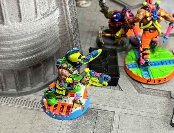 Terrain was also not my friend, because we had set up a big semicircle of gantry around the gunk tank, upon which Josh’s Squats could stand and rain fire down upon me. Fortunately the only thing more deadly in Necromunda than an unobstructed line of sight is falling from high places, so at least I had that going for me.