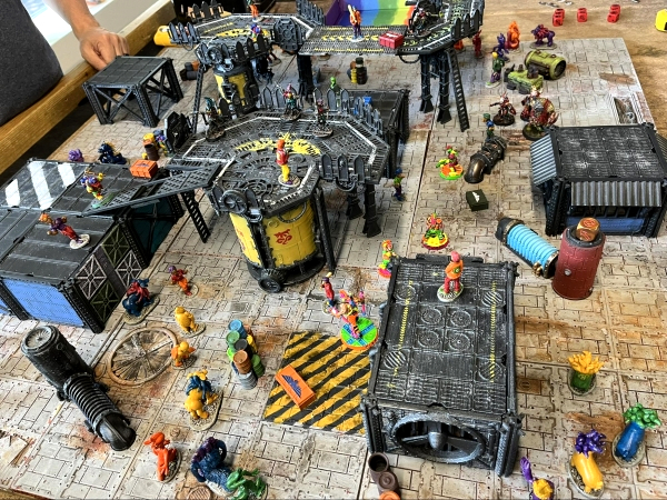 The scenario started thusly: I purchased and painted up a big tube of super cheap models. So they were slightly larger than the Necromunda models, and they all looked like stock characters from Happy Days, who cares. NInety models for $24! Close enough! They’re all from Uphive where they have better nutrition and 50s retro fashion is in! I put fifteen of these Hivers around the board and told the players to begin deploying within 12” of the board center. Each of us selected d3+2 of our crew - I didn’t want to deal with full crews on top of everything else which would be on the board, and I wasn’t quite dickish enough to make it a random selection.