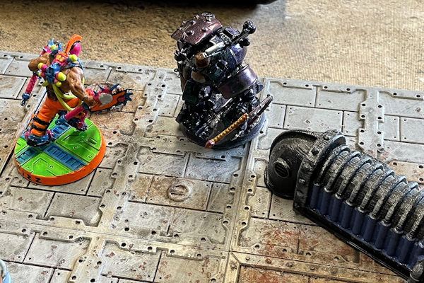CHRIS: We had gangers standing about three inches from each other, repeatedly shooting but failing to wound, so we took turns lying down for a bit until you got through with a Serious Injury and just coup-de-graced me. Pure Necromunda.