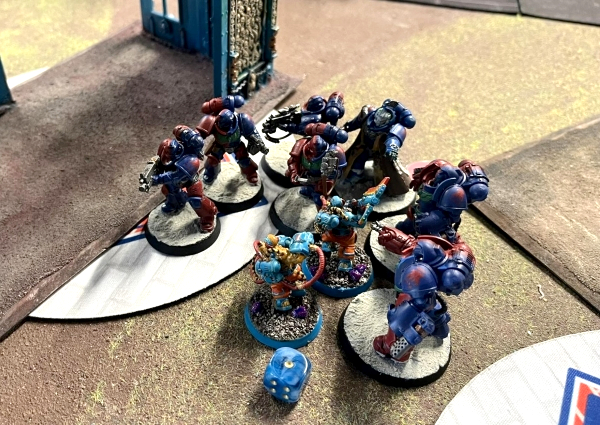 The Beserks did live the dream and charged into the Intercessors …and then promptly got Heroic Interventionated by the Aggressors. I should have just focused down the Aggressors but I stupidly split my attacks between the two units and ended up removing one Aggressor and a couple Intercessors rather than (possibly) the entire block of the scary bad touch Gravis boys.