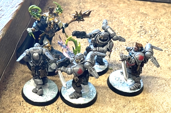 Peter Cannon…Thunderbolt! if you’re a dusty old mummy of a comics nerd like me. I’d seen a picture of Jericho’s patrol a couple days ahead of the tournament and remarked to Drew I was somewhat fearful of the force. My kin’s record against Intercessors was not great, and Librarian Marcellos (