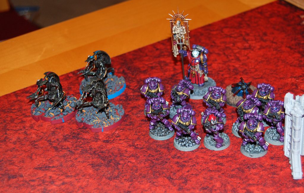 DREW: During setup I realized that while I had taken my army case with my infantry along with me, I had left behind my vehicles case. I didn’t have any vehicles, so why take it? Play the home game with me, friends: of course I left something I needed in the vehicles case. Centurions are infantry, true, but they’re also about twice the size of Tactical Marines and so they needed to live in the vehicle case. Thankfully we managed to find an acceptable substitute in terms of base size, and so the part of my Centurions would be played by the baller-ass droids known as droidekas.