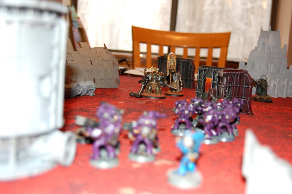 Speaking of backfield, that’s exactly where I spent my first two turns since I had the luxury of relative safety. Most of my army either hung back or slowly lumbered up the field while my Reivers and Infiltrators took turns completing the Nachmund Data and Recon actions on their respective objectives. This meant that during their turns they mostly got paid to sit on their asses and play solitaire, but it also earned me a decent number of victory points.