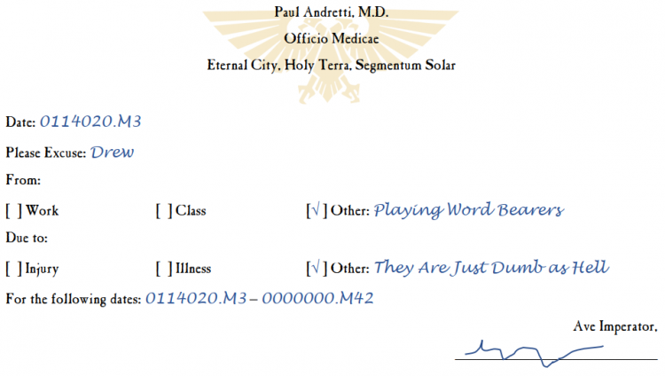 DREW: Come for the poorly thought out 40k opinions, stay for the familial love. Anyway, good news, Black Legion: nostalgia wins! I’ve already bought that Daemon Prince and eBayed up another Master of Possession and bits to make a flying Chaos Sorcerer, so I guess I’m fully on the path to my old bullshit. Enough about me, though, fucko: let’s talk about you. You know what you did.