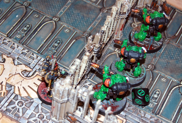DREW: In terms of the narrative, the Salamanders arrived on Vordanis Tertius in search of clues to help them piece together what happened here and answer distress calls from the surface. This planet once held an Adeptus Mechanicus Research Station (Diodatus VI) that burgeoned on becoming a full Forge World, but obviously something terrible happened since “smoking ruin” is the hot new architectural style. While the Salamanders hunt for supply caches for the survivors they come across a Black Legion scouting force out to taint the supplies both physically/spiritually and with scrapcode.