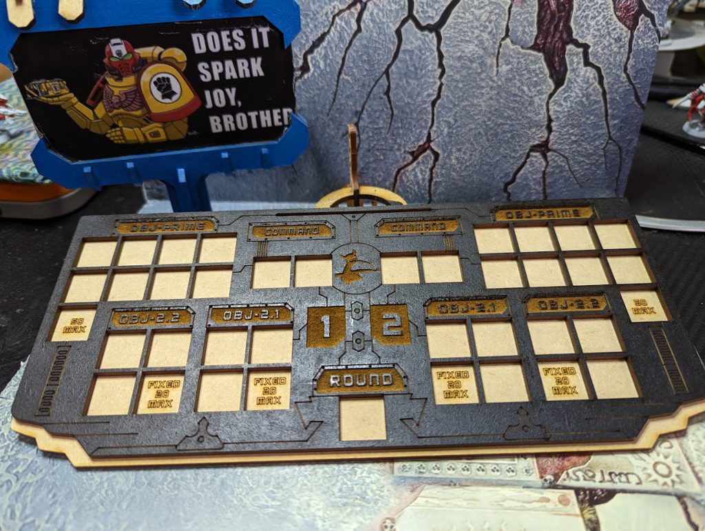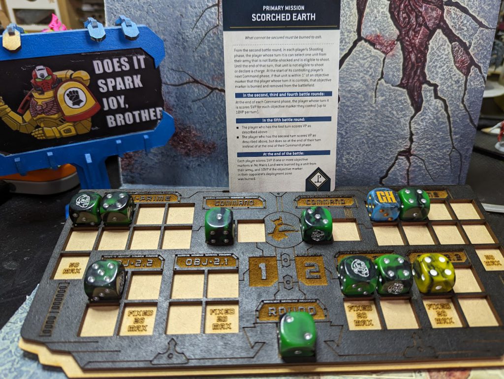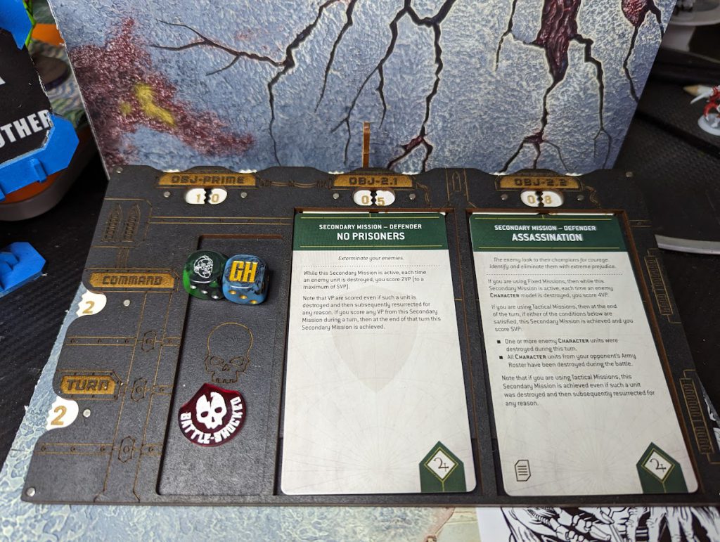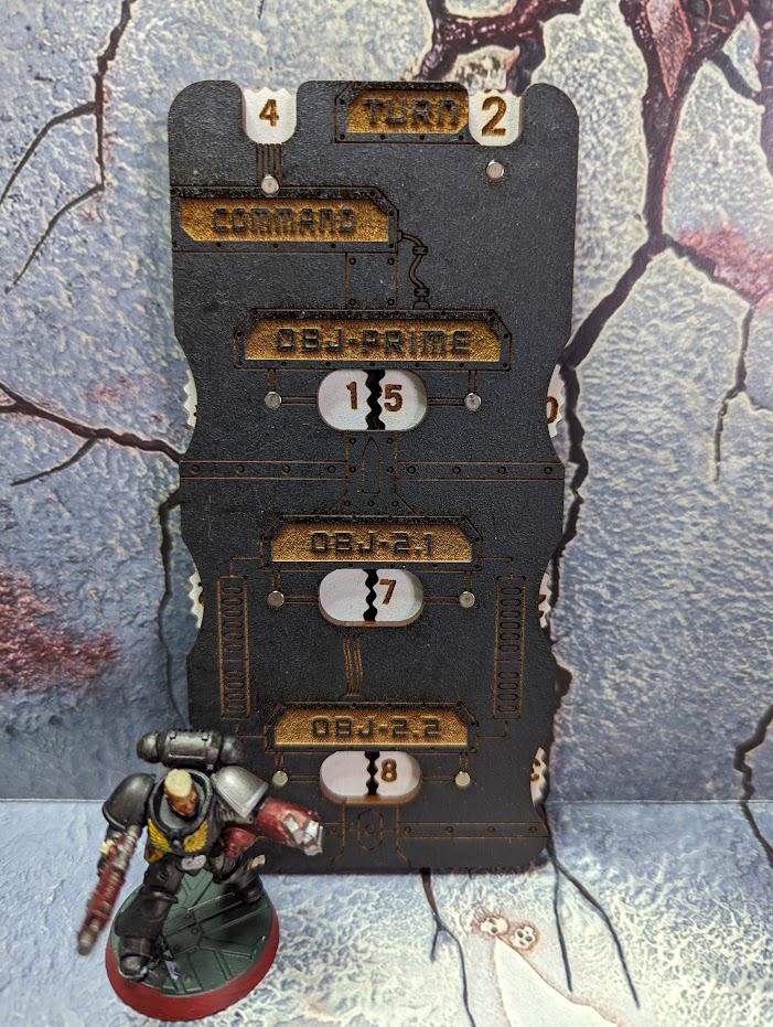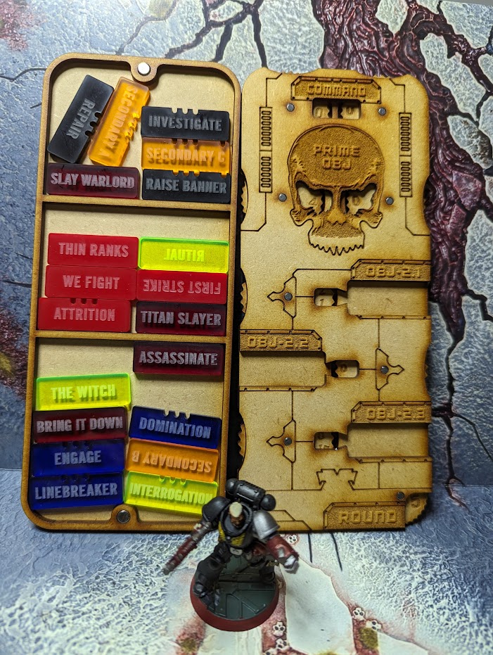 - The Mission Command Stack has dials to help you keep track of your Primary and Secondary points along with what turn you’re on and how many Command Points you have available. It has spaces to hold your current Secondary mission cards for fixed or tactical mission play and a space to keep special dice and tokens separate.